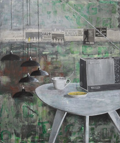 collage, newspaper, acrylic on canvas. 100 x 120 cm